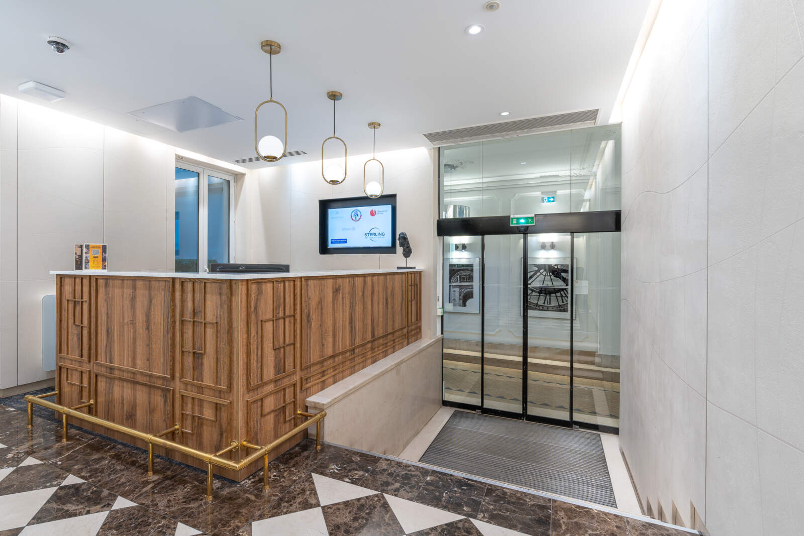 Pose de marbre dans la zone d’accueil pour renforcer l’identité premium du lieu.